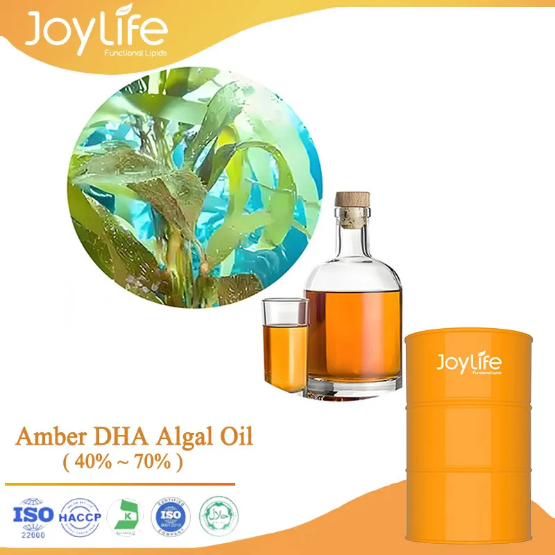 Joylife’s Amber color DHA Algal oil is made from extracts of Sshizochytrium Sp. with advanced precise and moderate refining processing technology. It is an amber oily liquid at room temperature and its DHA content ranges from 40% to 80%.